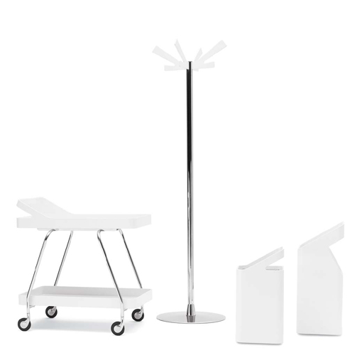 K line range includes free standing coat hanger, wall mounted hanger, waste basket, umbrella stand, serving trolley and mirror. All finishes are white lacquer except metal parts which are chromed. The umbrella stand and waste basket includes plastic container.