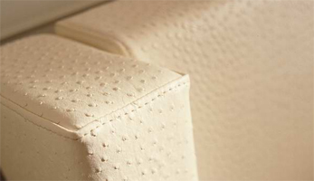 Mimosa bed is available with integrated slatted base with either mechanical or electrical movement or with storage compartment.The Mimosa bed is covered in leather, above image shows "ostrich skin effect leather".