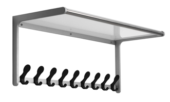 Hat rack is secured to the wall and comes with a glass shelf, hooks and rails for coat hangers. The wall mounted hanging bar is comes with 3, 5 or 9 hooks.