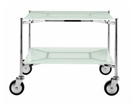 TV trolley with chromed tubular steel structure on castors, frosted and tempered 8mm thick glass shelves. O/all dims: 680x500x510hmm.