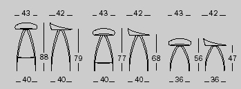 Lyra stools are available in three seat heights and have three different frame finishes. The seats are available as shown below. Dimensions shown are in cms.