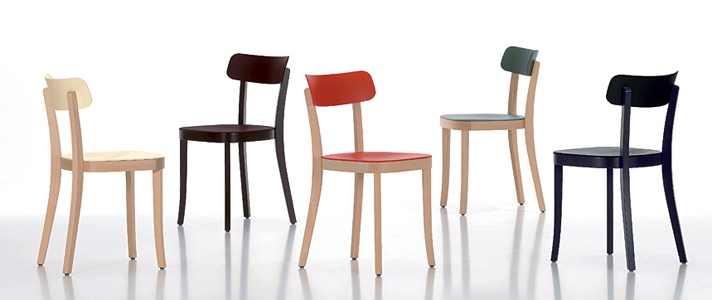 Basel chair, designed by Jasper Morrison and produced by Vitra, is a four-leg chair with a natural beech or dark stained beech frame, with the seat and backrest made of ASA plastic dyed throughout. With glides for carpets and optionally with glides with felt pads for hard floors. |