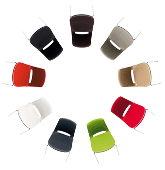 The Palm chair comes in a choice of nine colours: white, brick, grey, anthracite, moka, black, green, sand and red. Palm chair can have a chromed steel, shiny aluminium or painted base. Palm has various base options available and can come with or without arms.