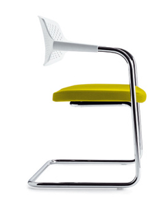 The backrest is made from polymer plastic and is available in white, ice blue or graphite. It can also be upholstered. The cantilever frame is available in chrome or painted dark grey. Seat is upholstered in fabric or leather.