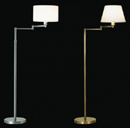 The Hansen P light is available in polished brass, English bronze or satin nickel. Two shade options are available: conical - available in white or beige Trilon fabric: or cylindrical - available in white or beige card. There are two options in the floor light; height adjustable and fixed height. Wall and table lights are available in this collection.
