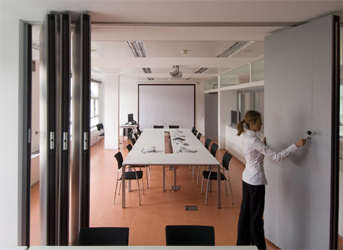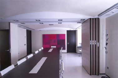 Dynamobel movable partition system solves multiuse-area management requirements, allowing areas to be used in their entirety or divided up qickly. It consists of independent, retractable modules which glide via carrying blocks with ball bearings along a track fixed to the ceiling and which are inter-assembled to form a solid wall.