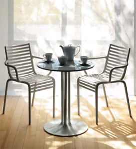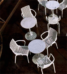 Pip-e chair, designed by Philippe Starck is a stackable (max 4 pieces) polypropylene monobloc armchair in white, yellow, orange and grey colour. Pip-e is suitable for indoor and outdoor use. A Pip-e table is available to complement the chair (image on the right.) |
