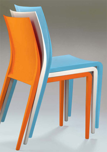 Saira chair is a stackable, monoshell chair and is available in solid nylon or translucent plastic. The colours in solid nylon are red, black, white, cream, orange, lime green and light blue. Translucent colours are clear, red, orange, lime green, light blue and grey.