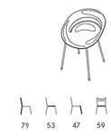 Tina has two base options, 4 legs (aluminium or titanium lacquer or chromed) and swivel base (chromed only). Seat options in plastic are as follows: - transparent (red, blue, clear, smoke, orange) and glossy white or black. |
