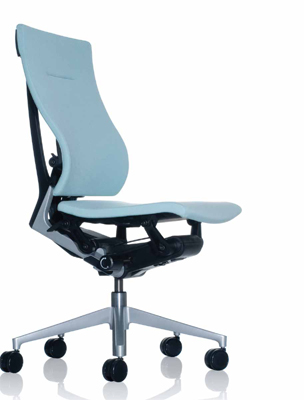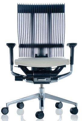 Orangebox's Spina task chair designed by Yasuhiro Nakamura, uses a special elastomer to reduce heat retention and moisture collection, and increasing back contact and support. The upholstered version, uses special fabric as to not negate the effects of the elastomer.