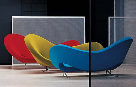 Moroso's Victoria and Albert collection, designed by Ron Arad, is available as a left or right handed sofa or equal size backs - 205 or 255cms wide. Fabric upholstery is removable but leather upholstery is fixed. Feet are varnished steel. The structure is made from stress-resistant polyurethane foam in varied density over fibre glass reinforced resin structure with steel support. |