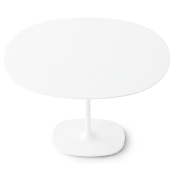 Arper's Dizzie table was designed for easy yet polished interior design schemes, Dizzie tables are ideal for various settings, from homes to restaurants. The base comes in white-painted steel or chrome finish, with a distinctive conical shape. The top is available in a number of versions and sizes: large oval, round, square, rectangular with D ends up to 3000mm long.