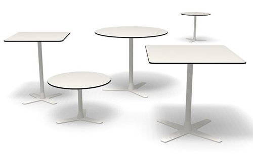 Propeller range of tables is available with a white or chrome frame. Standard top finishes are birch veneer with birch lipping or compact white laminate with black edge. |